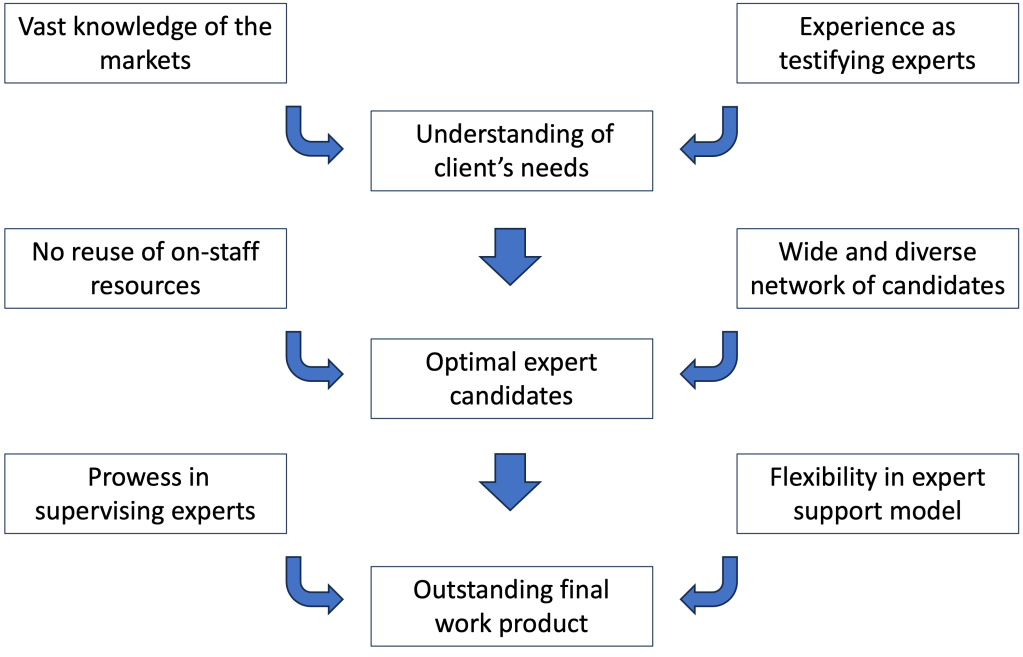 Our only consideration is delivering the best and most compelling work product for our clients. We facilitate each engagement individually and tailor our support of the expert to the needs of each assignment. We are indifferent to providing a light touch or heavy involvement and have worked successfully in collaborations with numerous other litigation consulting firms.